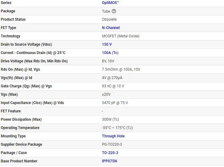 mOSFET de potencia 75V 80A IPP075N15N3G IPP075N15N TO-220 para control de motor y fuentes de alimentación